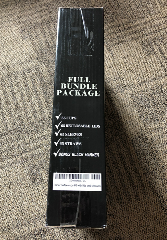 Sugarman Creations 65 Pack 12oz White Disposable Paper Coffee Cups With Black Resealable Lids, Heat Resistant Sleeves, Plastic Stirrers And Black Permanent Marker For Labeling
